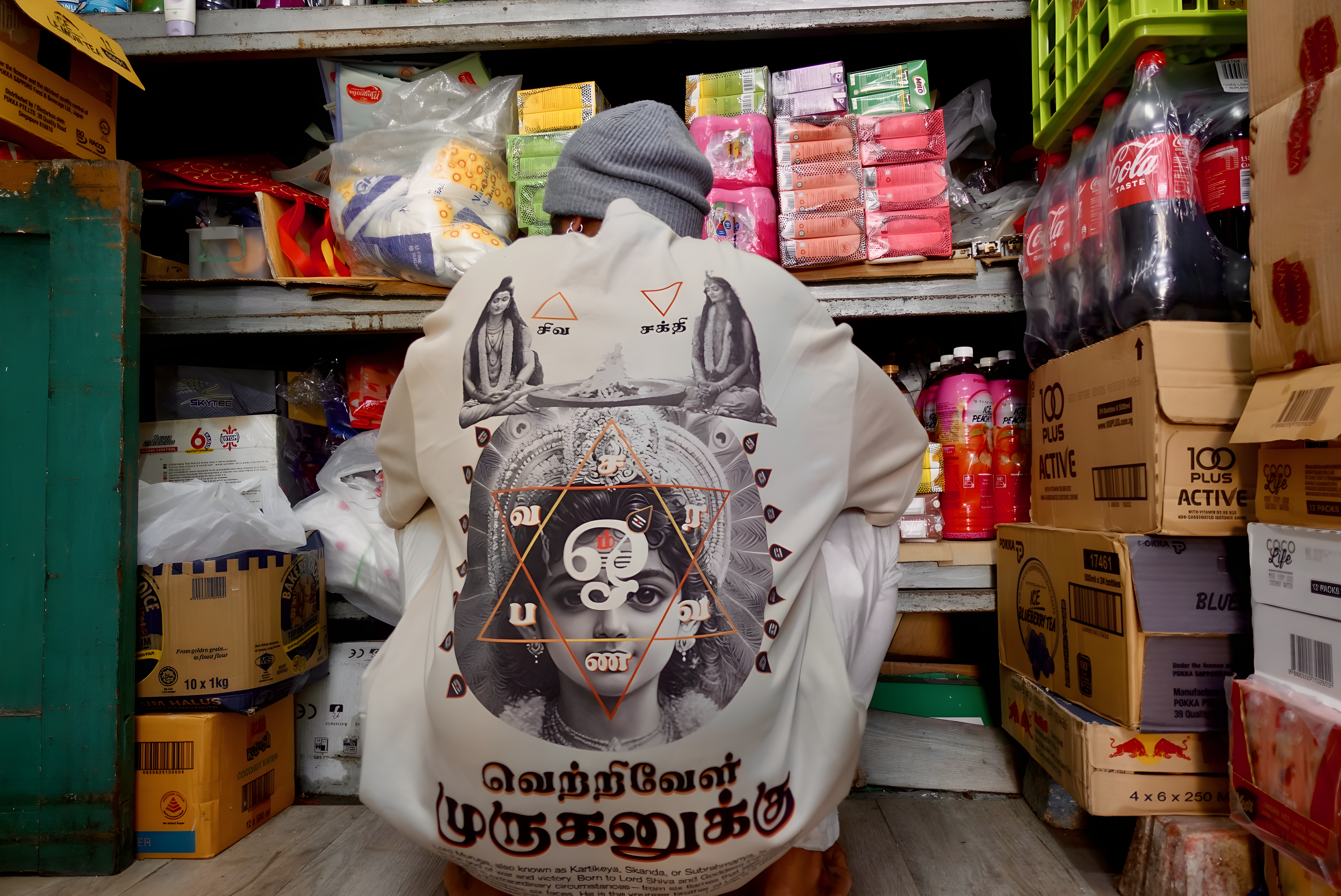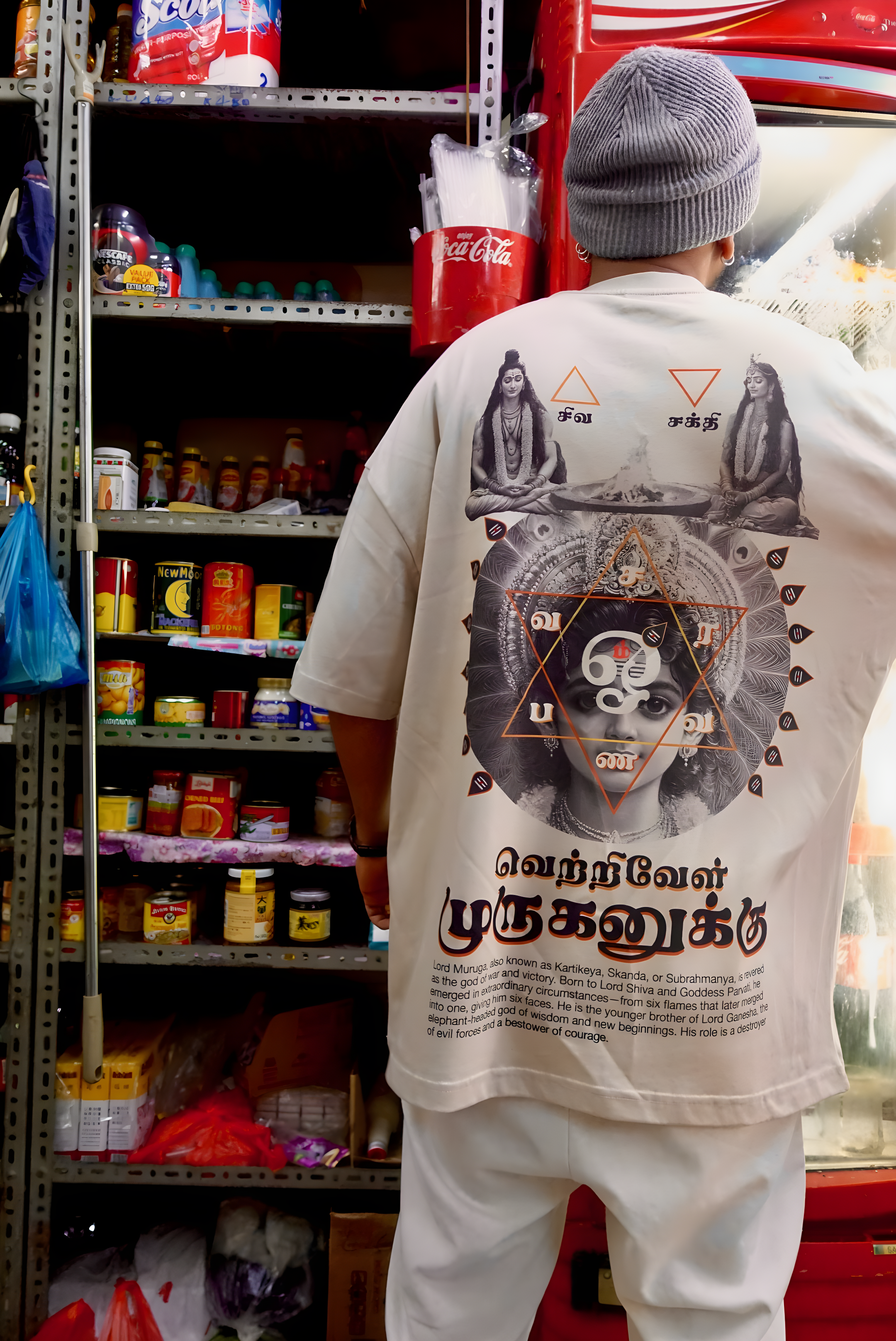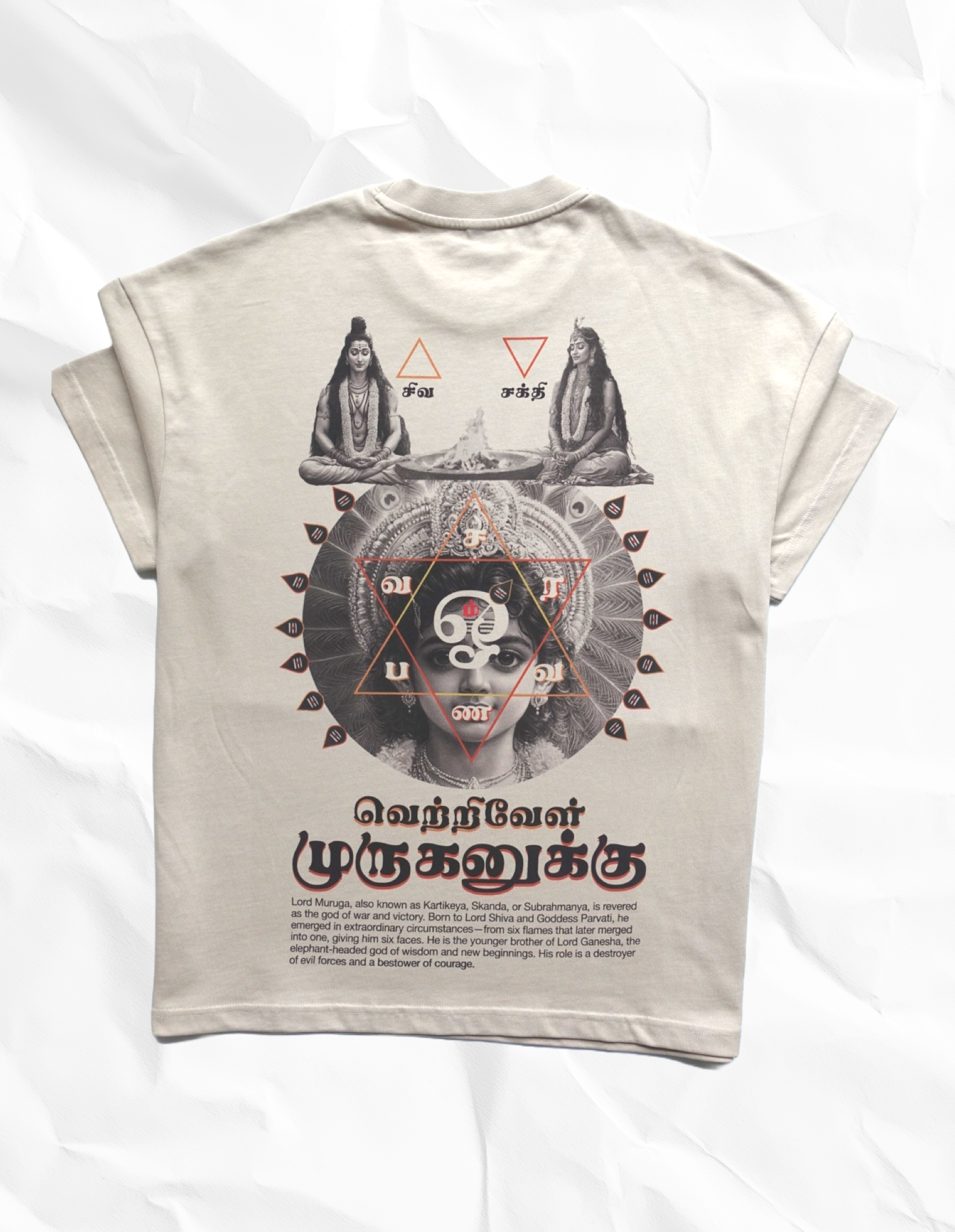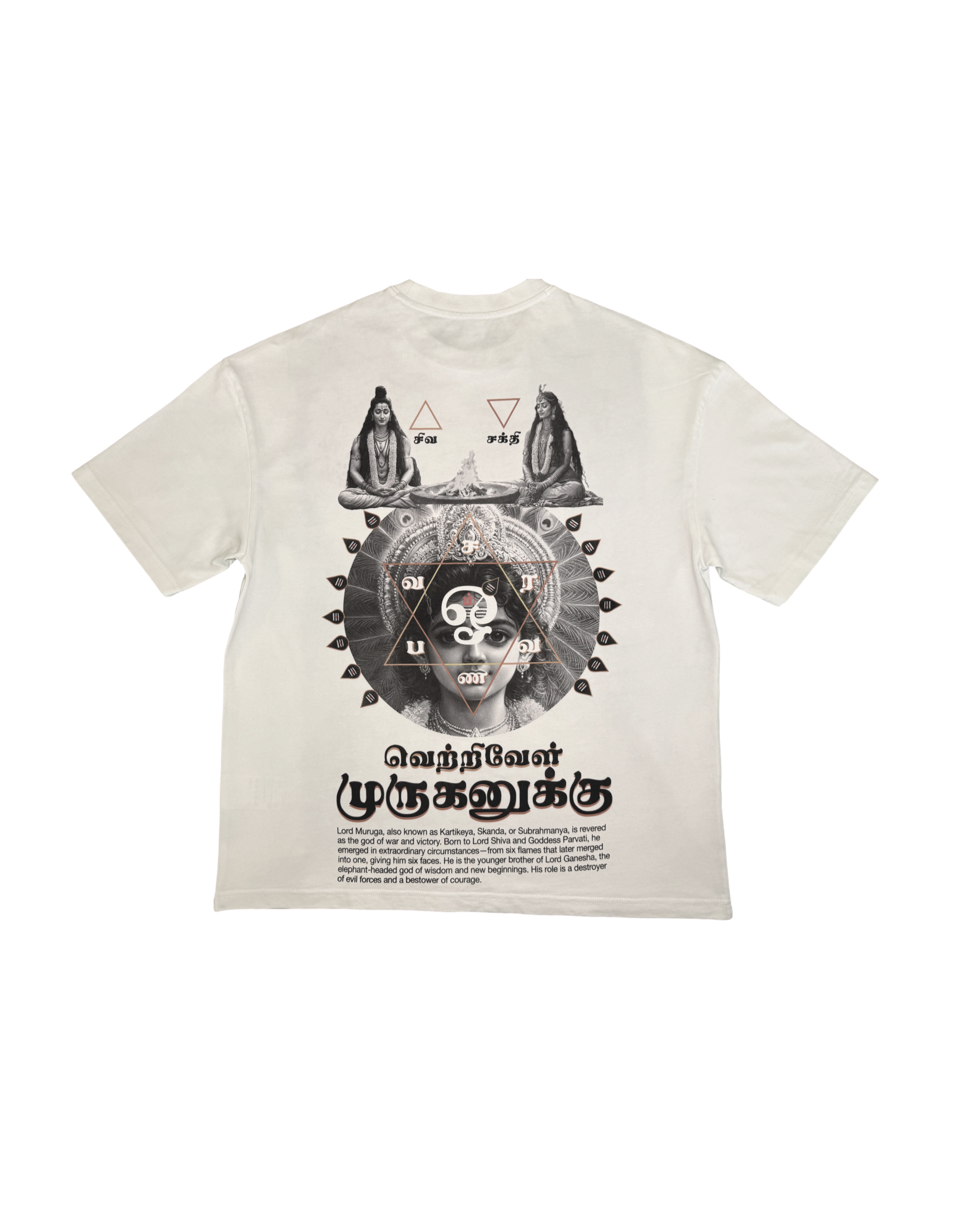 Arguably any Tamil's favourite deity, Lord Murugan. Born to Lord Shiva and Goddess Parvati, this design literally showcases the "Siva" and "Shakti" coming together as the 6-faced son, symbolised by the 6-sided star, emerges.