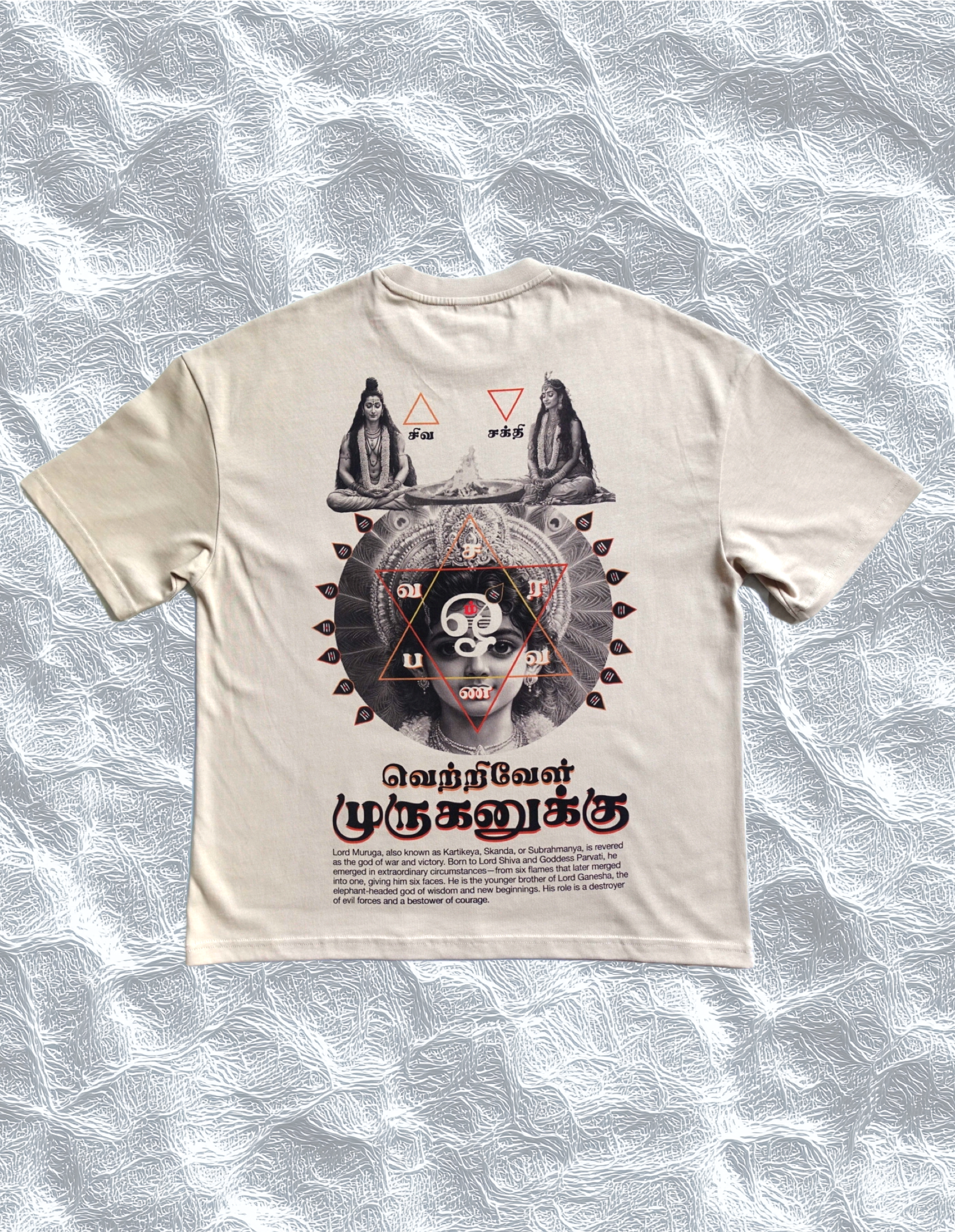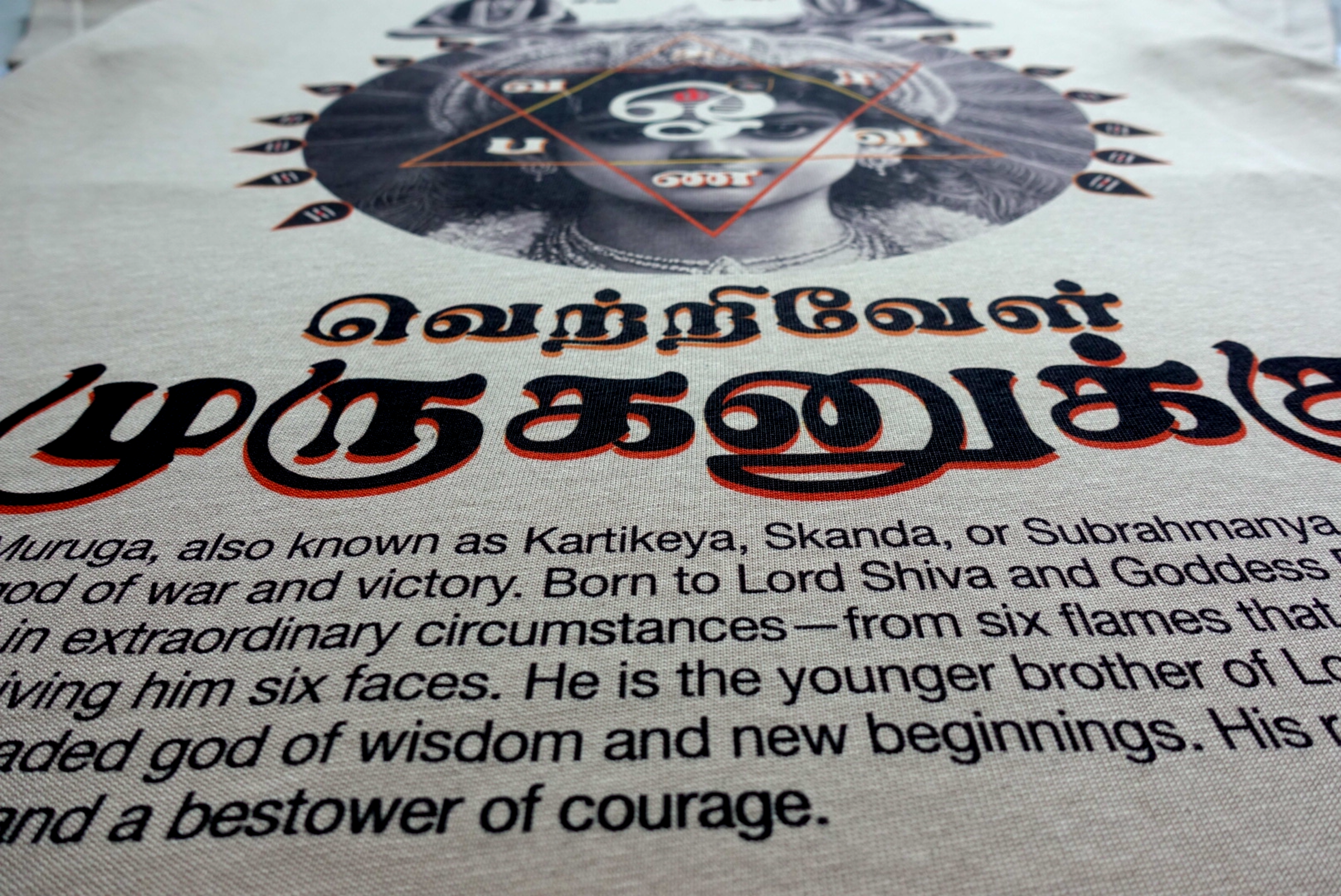 In direct translation each point of the star would mean, "Sa, Ra, Va, Na, Ba, Va", representing the 6 stages of wisdom and knowledge. The Om, with his signature spear, along with a beautiful baby Lord Murugan face, cheekily looking on from the background.
